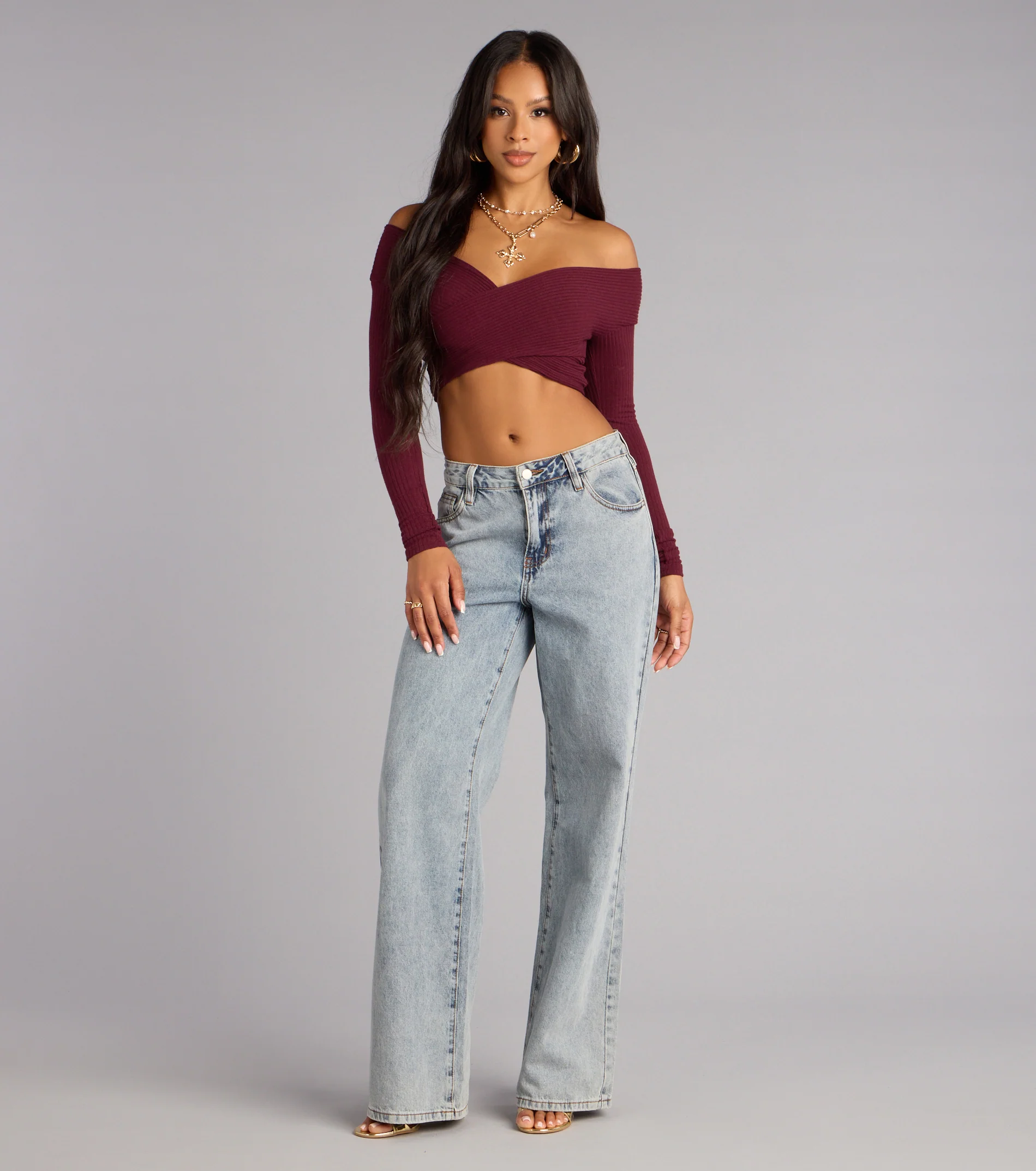 Soft, sleek, and a little sultry. This off-shoulder ribbed crop top wraps you in comfort with a flirty crossover neckline that’s perfect for casual date nights or daytime outings.